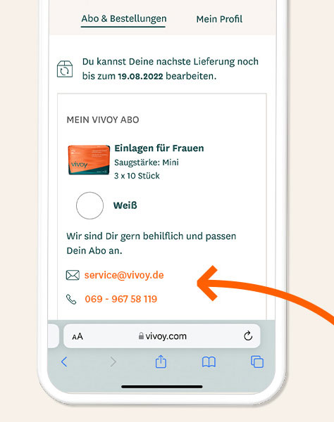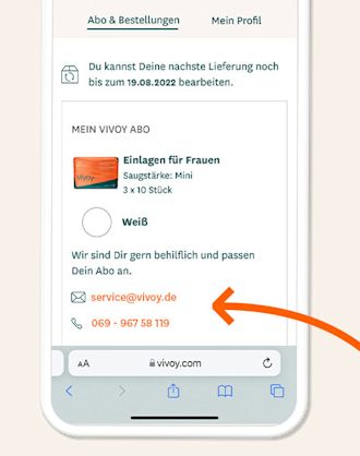 Einer Sache kannst Du Dir sicher sein: Unser Vivoy Team steht Dir bei Fragen und Bedenken rund um Dein Abo gerne zur Seite. Ganz gleich, ob Du die Produkte in Deiner nächsten Abo-Box anpassen, das Lieferintervall und Lieferdatum ändern, oder Dein Abo beenden möchtest – unser Kundenservice unterstützt Dich sowohl telefonisch als auch per E-Mail. Dank unseres Abo-Konfigurators kannst Du alle Änderungen aber auch selbstständig im Benutzerkonto vornehmen.